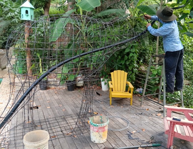 Ngày 6/7/2024, sáng nay, chúng tôi bắt đầu phủ lớp xi măng thô lên khung sắt. Trời bắt đầu mưa, khiến việc thi công trở nên khó khăn hơn. Chúng tôi phải bảo vệ tượng khỏi mưa bằng cách che phủ.